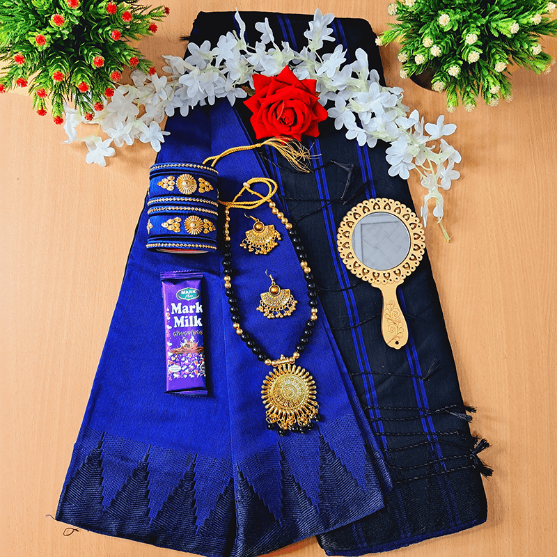 Tangail Soft Hafslik Saree Combo Gift set (Student Budget Combo) saree churi necklace chocolate ayna golap gazra etc