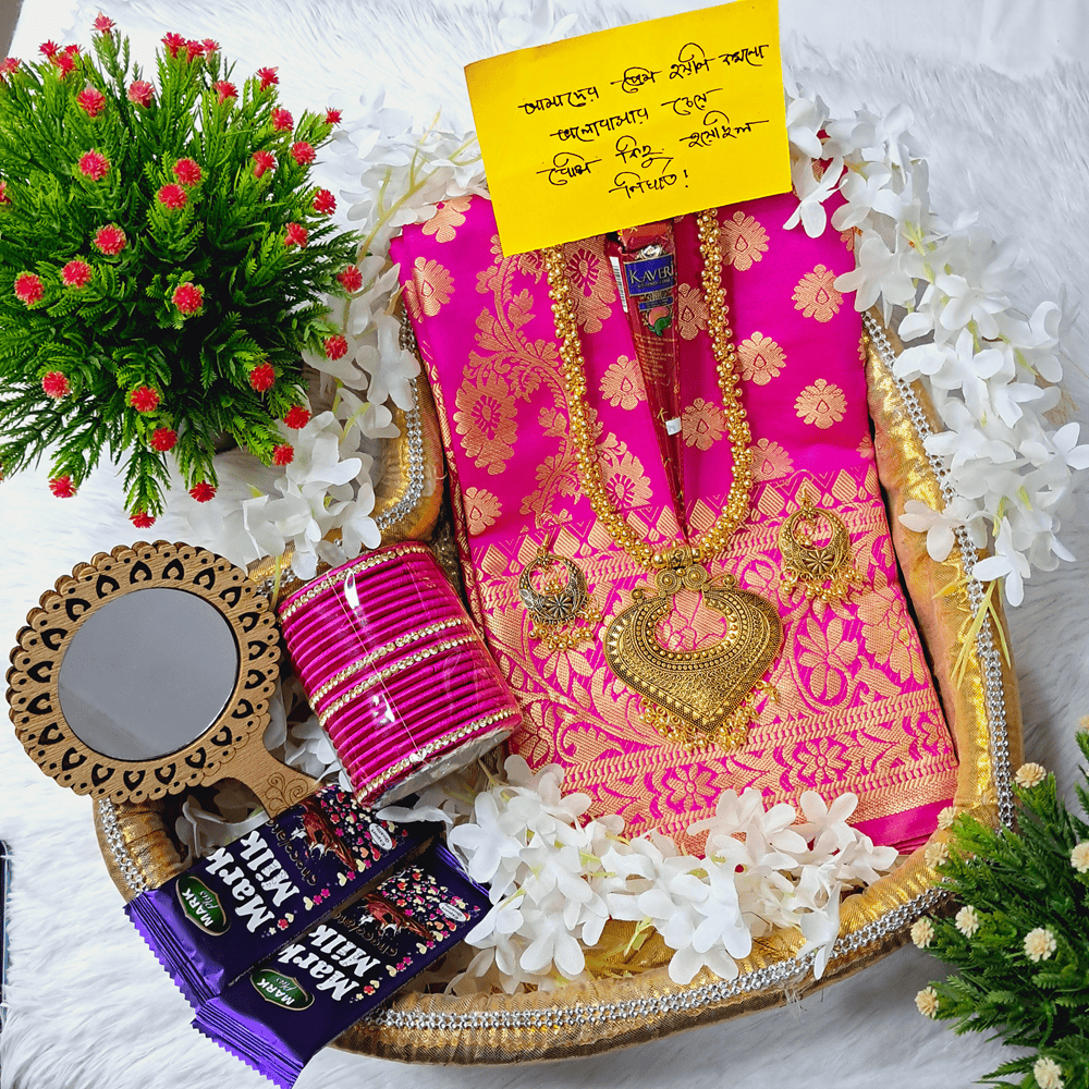 Tangail Tat Katan Saree Combo Set for Women – Saree Churi Necklace Gazra Chocolate Mirror Etc
